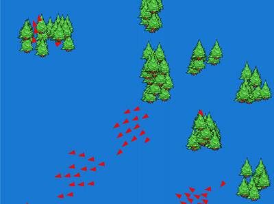 In deinem Programm ermittelst du die Nachbarknoten so, dass du von den 4 angrenzenden Zellen diejenigen auswählst, die nicht auf der Wand und nicht ausserhalb des Gitters liegen. Ein Vogel im Schwarm möchte einerseits seinen Nachbaren nahe sein, andererseits möchte er Kollisionen vermeiden. Sein Verhalten lässt sich mit folgenden Regeln beschreiben: 1. Separation: Jeder Actor hält einen gewissen Abstand zu den Nachbaren, um mögliche Kollisionen zu vermeiden. Der Beschleunigungsvektor des Akteurs ist entgegengesetzt zum Vektor der Summe der Positionen der Nachbarn. 2. Aligment: hat zum Ziel, die Geschwindigkeit und Richtung an die Bewegung der Nachbarn anzugleichen. Der Geschwindigkeitsvektor des Akteurs wird als Mittelwert der Geschwindigkeitsvektoren der Nachbarn gebildet. 3. Cohesion: hat zum Ziel, den Schwarm zusammenzuhalten und lässt den Akteur möglichst nahe beim Nachbarn bleiben. Die Richtung des Beschleunigungsvektors des Akteurs zeigt in Richtung des gemeinsamen Schwerpunktes der Punktmassen der Nachbarn. Programm: # Swarm.py from gamegrid import * import math import random class Tree(Actor): def __init__(self): Actor.__init__(self, "sprites/tree1.png") class Bird(Actor): def __init__(self): Actor.__init__(self, True, "sprites/arrow1.png") self.r = GGVector(0, 0) # Position self.v = GGVector(0, 0) # Velocity self.a = GGVector(0, 0) # Acceleration # Called when actor is added to gamegrid def reset(self): self.r.x=self.getX() self.r.y=self.getY() self.v.x=startVelocity*math.cos(math.radians(self.getDirection())) self.v.y=startVelocity*math.sin(math.radians(self.getDirection())) # ----------- cohesion --------------- def cohesion(self, distance): return self.getCenterOfMass(distance).sub(self.r) # ----------- alignment -------------- def alignment(self, distance): align = self.getAverageVelocity(distance) align = align.sub(self.v) return align # ----------- separation ------------- def separation(self, distance): repulse = GGVector() # ------ from birds ------ for p in birdPositions: dist = p.sub(self.r) d = dist.magnitude() if d < distance and d != 0: repulse = repulse.add(dist.mult((d-distance)/d)) # ------ from trees ------ trees = self.gameGrid.getActors(Tree) for actor in trees: p = GGVector(actor.getX(), actor.getY()) dist = p.sub(self.r) d = dist.magnitude() if d < distance and d != 0: repulse = repulse.add(dist.mult((d-distance)/d)) return repulse # ----------- wall interaction ------- def wallInteraction(self): width = self.gameGrid.getWidth() height = self.gameGrid.getHeight() acc = GGVector() if self.r.x < wallDist: distFactor = (wallDist - self.r.x) / wallDist acc = GGVector(wallWeight * distFactor, 0) if width - self.r.x < wallDist: distFactor = ((width - self.r.x)-wallDist)/wallDist acc = GGVector(wallWeight * distFactor, 0) if self.r.y < wallDist: distFactor = (wallDist - self.r.y) / wallDist acc = GGVector(0, wallWeight * distFactor) if height - self.r.y < wallDist: distFactor = ((height - self.r.y)-wallDist)/wallDist acc = GGVector(0, wallWeight * distFactor) return acc def getPosition(self): return self.r def getVelocity(self): return self.v def getCenterOfMass(self, distance): center = GGVector() sum = 0 for p in birdPositions: dist = p.sub(self.r) d = dist.magnitude() if d < distance: center = center.add(p) sum += 1 if sum != 0: return center.mult(1.0/sum) else: return center def getAverageVelocity(self, distance): avg = GGVector() sum = 0 for i in range(len(birdPositions)): p = birdPositions[i] if (self.r.x - p.x)*(self.r.x-p.x) + \ (self.r.y - p.y)*(self.r.y-p.y)<distance*distance: avg = avg.add(birdVelocities[i]); sum += 1 return avg.mult(1.0/sum) def limitSpeed(self): m = self.v.magnitude() if m < minSpeed: self.v = self.v.mult(minSpeed / m) if m > maxSpeed: self.v = self.v.mult(minSpeed / m) def setAcceleration(self): self.a = self.cohesion(cohDist).mult(cohWeight) self.a = self.a.add(self.separation(sepDist).mult(sepWeight)) self.a = self.a.add(self.alignment(aligDist).mult(aligWeight)) self.a = self.a.add(self.wallInteraction()) def act(self): self.setAcceleration() self.v = self.v.add(self.a) # new velocity self.limitSpeed() self.r = self.r.add(self.v) # new position self.setDirection(int(math.degrees(self.v.getDirection()))) self.setLocation(Location(int(self.r.x), int(self.r.y))) # global section def populateTrees(number): blockSize = 70 treesPerBlock = 10 for block in range(number // treesPerBlock): x = getRandomNumber(800 // blockSize) * blockSize y = getRandomNumber(600 // blockSize) * blockSize for t in range(treesPerBlock): dx = getRandomNumber(blockSize) dy = getRandomNumber(blockSize) addActor(Tree(), Location(x + dx, y + dy)) def generateBirds(number): for i in range(number): addActorNoRefresh(Bird(), getRandomLocation(), getRandomDirection()) onAct() # Initialize birdPositions, birdVelocities def onAct(): global birdPositions, birdVelocities # Update bird positions and velocities birdPositions = [] birdVelocities = [] for b in getActors(Bird): birdPositions.append(b.getPosition()) birdVelocities.append(b.getVelocity()) def getRandomNumber(limit): return random.randint(0, limit-1) # coupling constants cohDist = 100 cohWeight = 0.01 aligDist = 30 aligWeight = 1 sepDist = 30 sepWeight = 0.2 wallDist = 20 wallWeight = 2 maxSpeed = 20 minSpeed = 10 startVelocity = 10 numberTrees = 100 numberBirds = 50 birdPositions = [] birdVelocities = [] makeGameGrid(800, 600, 1, False) registerAct(onAct) setSimulationPeriod(10) setBgColor(Color.blue) setTitle("Swarm Simulation") show() populateTrees(numberTrees) generateBirds(numberBirds) doRun() |