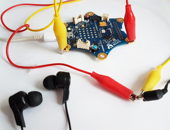 | You must connect the headphones to the outputs labeled GND and P1. Play a tone with the frequency f with the command pitch(f, time). With play(song) you can play entire melodies, either as a tone sequence or in musical notation. |