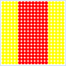 In einem Quadrat werden zufällig 50 000 Punkte gewählt. Wenn ein Punkt innerhalb der einbeschriebenen Kreises liegt, wird er rot, sonst grün gezeichnet. Da der Radius des Kreises 100 ist, gilt für die innere Punkte die Bedingung x2 + y2 < 1002. Das Zeichnen eines Kreises in der entsprechenden Farbe an einer zufällig gewählten Position definierst du in der Funktion randomDot().